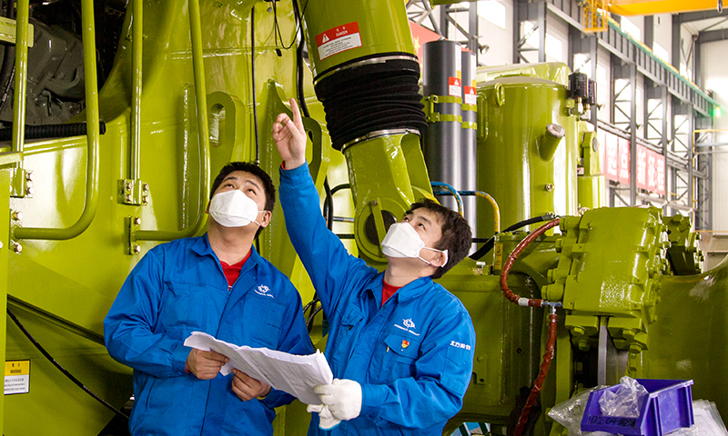 圖為北重集團北方股份一線員工趕制生產(chǎn)進度。