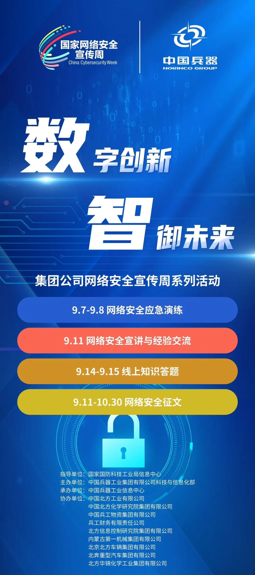 9月11日至17日,中國(guó)兵器工業(yè)集團(tuán)有限公司以“數(shù)字創(chuàng)新 智御未來(lái)”為主題,圍繞集團(tuán)公司“1+5”戰(zhàn)略和“雙十”規(guī)劃,組織開展集團(tuán)公司網(wǎng)絡(luò)安全宣傳周系列活動(dòng)。 9月11日,集團(tuán)公司科技與信息化部組織在京單位召開網(wǎng)絡(luò)安全宣講與經(jīng)驗(yàn)交流活動(dòng),邀請(qǐng)公安部第一研究所網(wǎng)絡(luò)安全專家針對(duì)網(wǎng)絡(luò)安全形勢(shì)和個(gè)人防護(hù)技能以及網(wǎng)絡(luò)安全等級(jí)保護(hù)主要工作環(huán)節(jié)和標(biāo)準(zhǔn)應(yīng)用作專題講座,會(huì)上北方公司、物資集團(tuán)、財(cái)務(wù)公司、北方車輛集團(tuán)、北奔重汽進(jìn)行了工作經(jīng)驗(yàn)分享。