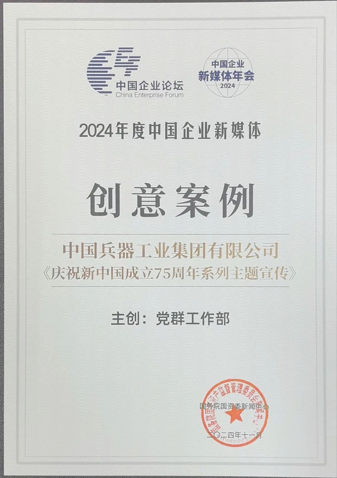 中國企業(yè)新媒體年會現(xiàn)場發(fā)布了“2024年度中國企業(yè)新媒體創(chuàng)新獎、創(chuàng)意獎、創(chuàng)作獎”,其中,集團公司《慶祝新中國成立75周年系列主題宣傳》榮獲2024年度中國企業(yè)新媒體創(chuàng)意案例。